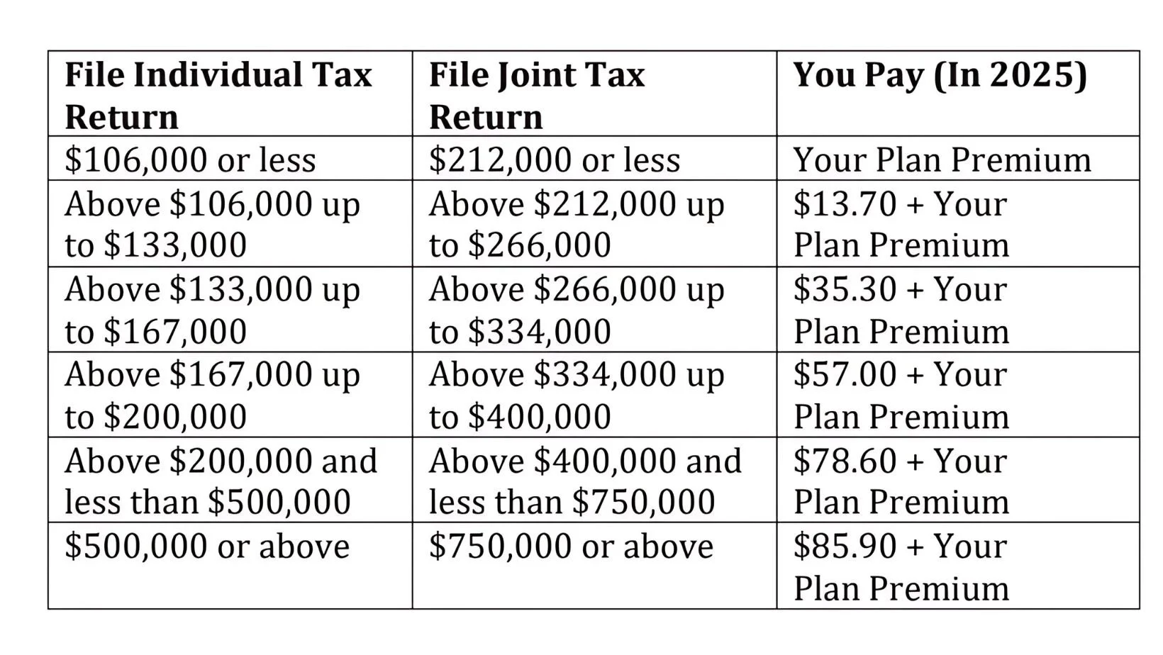 The income brackets for the 2025 Part B IRMAA are as follows: